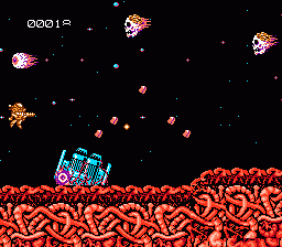 Очередная космическая аркада с движением направо. Главный герой космонавт в скафандре. Синие создания умирая оставляют призы.